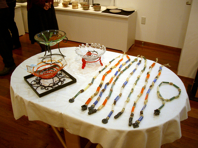昨日、5日より「炎の三彩 炎が結ぶガラス・鉄・陶3人展」がスタートしました。今回の目玉(今回のための特別企画)は3人の合作、「創作スピーカー」「着せ替えコンポート」「縄文風首飾り」の3点です。スピーカーは最終的にどんな感じに仕上がるのか誰にもわかりませんでしたが(笑)かなりいい感じに仕上がりました。どこに置いても部屋全体にふわっと音が響く感じです(^-^)。インテリアとしてもかなりいい感じだと思います。骨組みが私の鉄、上部の反響盤がガラス(ここに花とか金魚とかキャンドルを浮かべたり自在にアレンジできます)、側面の装飾が素焼きの陶板です。ロハスな感じたと思います。ちなみに昨日の初日に売れてしまいました(!)注文制作に応じまーす(^-^)。コンポートは、脚の部分が私の鉄、器はガラスと陶器の2種類差し替え可能という3点セットです。3人で各1セットずつデザインし、お互い自分がデザインした物の制作を発注しあうという形をとりました。それぞれのバラバラな個性が反映されてひじょうに面白いものができました。そして、縄文風首飾り。これ、個人的にはすっごい気に入りました(笑)。ガラス・鉄・陶でそれぞれ巨大なビーズを作って、3人で一緒に麻ヒモでテキトーにがすがす組み合わせていっただけ。3人ともとてもこれが気に入ってしまって、「例えば、ビョークとかがこれをつけたら、いきなりワールドブレークだね!」とか言いながら(笑!!)男の人が身につけてもいい感じ。絶対余所では買えないし、自分でも作れないという稀少ものです(^o^)。詳細は私のHPの表紙にご案内しています。距離的に可能な方はぜひ遊びにいらしてくださいね。私は本日6日と、9(日)、12(水)、13(木)、最終日16日(日)におります。私がいる時は駅まで車でお迎えにあがりますので、気楽にご連絡ください(^-^)。月火は休廊なのでくれぐれもお気をつけくださいませ。