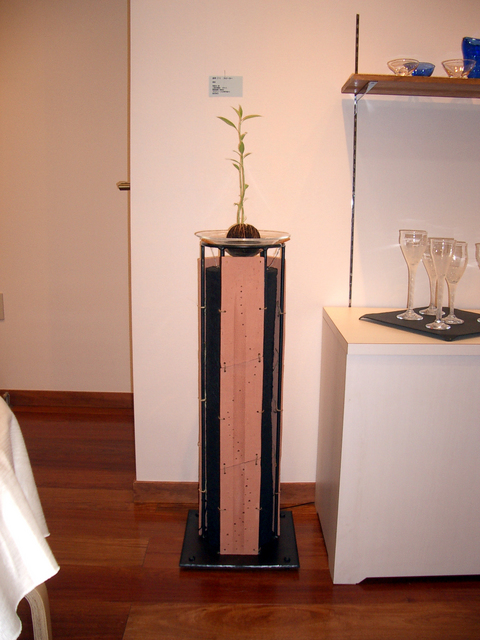 スピーカーはわかるかしら?鉄の細い棒6本で円筒(=六角柱)を作って、1列おき(つまり3列)に素焼きの陶板が麻ひもでゆわえつけてあります。内部は黒い和紙を円筒形にしてアンプを仕込み、鉄の筒にすぽっと入ってます。てっぺんのガラスは透明な円推型です。