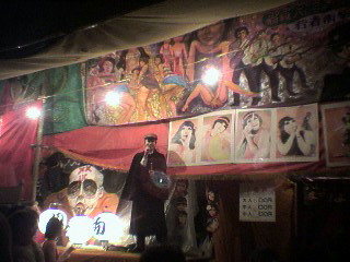 山田ひろの監督プロデュースの見せ物小屋は、エンターテイメントととしてかなり「本気」でした(笑)。ちゃんとしたバンドの演奏の音が外に聞こえてました(←ちなみに中には入っていない)。彼はモノクロ無声映画と同時に60年代的アングラなモノも好きなんだろうなと思います。