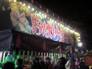 毎年、12月12日は十二日市。場所は中山道浦和宿。もといJR浦和駅から徒歩10分、調神社。「つきのみやじんじゃ」と読みます。1991年の結婚から約2年半、この調神社の近所に住んでおりました。ここは狛犬ではなく、2羽のうさぎちゃんが入り口を守る、狛うさぎで有名な神社です。「つきのみや=月の宮」月だから兎。関係ないけど、餃子で有名な宇都宮は「ウツの宮」鬱じゃなくて虚ね。うつろな所、つまり宇宙の宮。なんか素敵でしょ?(^-^) 中沢夫妻はかつて自分たちが住んだこの文京都市・浦和をたいへん愛しておりました(もちろん浦和レッズを応援(^o^))が、近年、駅周辺の大規模な再開発があり、なんとものほほんとした愛すべき芸術の町は姿を消してしまいました(ToT)。かつてたくさんの画家を輩出し、その影響か彩光舎というちょっと有名な画塾(美大の予備校でもある)もあったりして、休日になると調神社の隣の公園ではカンバスを持った若者を見かけたりしたものです。巨大なイチョウやケヤキがガーッとそびえ立ち並び、春にはピンク色に空気が霞むくらいたくさんの桜の花が咲きます。旧中山道沿いには古いお茶屋さん青山茶舗が自分ちの蔵を改造した「楽風」(らふ)という日本茶喫茶ギャラリーがあり、昔ながらの商店街には「やじろべぇ」という珈琲店や「ぎんねこ」なんていう粋な蕎麦屋があり、そして駅西口から続く商店街にはオブジェアーティスト鈴木三郎さんの経営する自転車屋さんがあり、「マチェック」というひじょうに怪しいアングラチックなカフェがありました。このマチェック(←「灰とダイヤモンド」の主人公の名前)は、若い頃演劇青年だった団塊世代のご夫婦が経営するたいへん素敵な空間で、きっかけはわかりませんが、関東近県のすべてのアイルランド人では?というくらいのアイルランド人たちがよく集っていました。で、トイレの壁はもの凄い落書きだらけ。新聞の記事でも取り上げられたこともある名物カフェでした。でした、そう過去形。鈴木三郎さんの自転車屋さんとマチェックは無くなってしまいました(ToT)。楽風の古い平屋の日本家屋のすぐ背景に巨大なマンションがそびえ建ちます。合成写真か映画のセットみたい。バーチャル。今は巨大なマンションやビルががんがん建ちつつあります。これじゃぁ、なんちゃって埼玉新都心です。今は合併してしまいましたが、かつての県庁所在地・浦和(←殆どの人が大宮だと思っていた)の意地でしょうか。あっ、閑話休題。十二日市の話でした(^-^;。旧中山道沿いにもの凄い数の露天がひしめき合う、調神社(と隣の調公園)歳末恒例・熊手市。これは北島三郎が買ったのと同じやつだよ!なんておじちゃんが宣伝してます。え〜?さぶちゃんならもっと大きいやつじゃないのかしらなんて思いながら、買い食いしつつそぞろ歩きます。最近はテキ屋界もインターナショナルで、ドネルケバブ(トルコ料理)、シャーピン(中国のお焼き)、チャプチェ(韓国のヤキソバ)、サモサ(インドの料理)とか売ってます(←ちなみに全部食べた(^o^))。その反面、射的だの金魚すくいだのも健在です。で。このお祭り、もう一つ名物があるの、知る人ぞ知る。昭和30年代的なお化け屋敷と見せ物小屋(演目は毎年「蛇女」笑)。すごいのよ、これが。大規模だけどチープというか、かなり昔ながらのものを忠実に継承しています。たぶん余所じゃ見れないと思います。で、なんか見せ物小屋の方の様子がいつもと違がったの。なんだかすごい今風でファンキー。きっとプロデューサー(笑)が替わったのね。。。。んんっ?このしゃべり方と声、どこかで聞いたことがあるぞ。お〜〜〜。私、この人、知ってる。小屋の前でマイクを持って嬉々として口上を述べ立てるお兄さん。以前、「カムイ」という殺陣集団(映画「キルビル」の殺陣の指導をした人たち)と「漁港」というバンド(本業が築地のお魚屋さんで、最後にいつもマグロをさばいてお客さんに振る舞うので有名)が新宿のライブハウスでライブをやった時に前座をやってたハレンチ映画監督だわ(名前失念ごめんなさい)。こんなとこでも営業活動してたなんて。わはは。ノータリン天国。これは、その見せ物小屋(演目はやっぱり蛇女)のポスターのキャッチコピー。「ハレンチ★ノータリン天国」うなりました(笑!)。