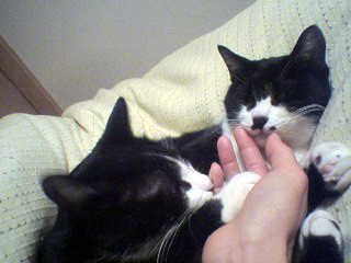 えっ?さんざんあっちこっち怪我をして、今度はインフルエンザにかかったのかって?日頃、流行には乗らないとか豪語してるクセにって?そんな、ずいぶんな。私じゃないですよ。中沢ポコちゃん(猫、白地に黒マント、オス、10歳)です。ちょうど1週間前の朝、彼のぐりぐりと大きな左の目にどぼっと目ヤニが。あらゴミでも入ったのかしらって、その時はティッシュでふいてあげました。夜、またどぼっと目ヤニが。あら変だわ。翌朝、彼の巨体(=5.7Kg)を籐の籠に押し込み、自分の病院の後、近所の動物病院に行ってみます。するとインフルエンザであることが発覚。ウィルスだから空気感染で、網戸越しでもうつってしまうのですって。怖い!くりまる(←先住民、白猫、たぶんメス、推定10数歳、わたしの命名)がうつしたに違いない!なかなか好戦的で厚かましい猫なのですが、先住民なので一応敬意を払っています(笑)。なのに、うちの超箱入り甘やかされモヤシっ子にゃんこたちに病気をうつすなんて!(←完全に決めてかかっている。笑)きゃっ大変。いつもポコちゃんにべったりの双子のメス猫・ロコちゃんにも感染しちゃうわ。でも、病院の先生によれば、必ず発病するわけではなく、(人間の)水疱瘡や結核みたいに、もともと体内に菌を保有しているのが、季節の変わり目とか、免疫力が低下している時に発病しちゃうそうです。ついつい子供扱いしてしまうのですが、10歳といえばかなりのご老体。色々そろそろ気遣ってあげなくちゃだわね。で、久々の病院。緊張して巨大な漬け物石のようにまぁるく硬直しているポコちゃん。籐籠から引っぱり出すのに一苦労。まだ発熱はしていませんが、家では出ていなかった鼻水で顔がぐしゅぐしゅになっています。おまけに、漬け物石になっていたお陰で鼻先を籐籠に擦って赤くなっています。抗生物質など粉薬2種、点眼薬、点鼻薬、しめて8275円。保険がきかないってキツイわね(>_<)。ところで、この2匹の猫は中沢家の飼い猫としては4代目。初代・トモエもん(キジトラ、メス)、2代・くまのすけ(白地にキジ、オス)、3代・ぶりまる(白地に黒ぶち、オス)。その間、自分のとこでは飼えずによそに斡旋した猫、数匹。猫ブローカー(笑)。トモエもんは短いくるりとしたスパイラルの尻尾で、それはそれは賢くて人なつこくて、後ろから見た立ち姿はまるでバレリーナのように可憐でした。くまのすけも頭が良くてなつこい子でした。彼はある日、我が家に迷い込んできたのですが、ちょっと焼き餅やきだったかな。大きくてぴーんと立派な耳が、まるで音に反応するパラボラアンテナみたいでした。ぶりまるは、有楽町の飲み屋の店先でホームレスしていた(当時まだ小さかった)彼を、私が拉致してきました。なんだか猫のくせにとても体が固くて、ちょっと性格がひねていました。愛情を注げば心を開いてくれるに違いないと思って手をかけてあげましたが、どうもちょっと素直じゃない。いたづらばっかりして、ある日、激怒しただんなさまに烈火のごとく叱られて、びびった拍子にうんちをちびって、命名「ぶりまる」(笑!!)。それでも、ある朝、歯を磨く私の足元にすり寄って不器用に一生懸命甘えようとする姿に、じぃーーーっんときちゃいました。当時まだ出版社に務めていた私。とても残業が多かったのですが、ある日、珍しく早くあがれました。その時、なんだか胸騒ぎがしましたが、まぁ普通に電車に乗って帰宅します。駅から歩いて家の近くまで来た時、向こうの方の暗闇の道のまん中に何か白いモノが落ちているのが見えます。瞬時に胸騒ぎの意味を理解した私。鞄を放り出して走り寄ります。「ぶりまるぅーーーーーっ!!!」車に跳ね飛ばされた、ぶりまる。まだ温かい。目が開いたまま。即死。膝をついて両手に彼を抱き、うぉんうぉん大声で泣きまくる私。まだ大人になっていなかった、ぶりまる。うぉんうぉん泣いていたところに、だんなさまも帰ってきました。二人で家の敷地の隅っこに穴を掘って、彼の好きだったおもちゃと一緒に埋めてあげました。翌朝、道のまん中、ぶりまるが倒れていた所にお線香が供えてありました。隣のおばさんです。で、それからしばらくして、隣のおばさんが、犬の散歩の時に見つけたよと言って、小さな小さな子猫を二匹拾ってきてくれました。「お宅、猫が好きでしょう?」って。1995年の春のこと。これが、ポコちゃんとロコちゃんです(^-^)。それはそれは愛くるしいポコちゃんとロコちゃん。片方の手のひらにすっぽり納まるくらい、ちっちゃな子猫。ほわほわとした産毛。神様からの賜り物。ぶりまるの一件があって以来、猫を家から出すのはやめました。今でも家の周りに出す時は、必ず首に紐をつけます。彼らもそれを命綱と思っているようです。そう、そして私は生涯彼らをバカみたいに溺愛し、他人になんと言われようと甘やかし続けると心に誓ったのです。なぁんてね。口だけ。けっこう邪険にしたり雑な扱い