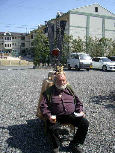 2006年5月3日、水曜日、午前11時すぎ。快晴。暑い。場所は滋賀県高島市マキノ町。とある旅館の別館座敷。友人の運転するワゴン車に乗って登場したのは、じゃじゃーーーーんっ!なんと、アルフレッド・ハーバーマン(Alfred Habermann)氏・75歳です!鍛冶屋界のフランク・シナトラ、三船敏郎、あるいは美空ひばり。日本にいれば、間違いなく人間国宝の、チェコが生んだ偉大なるマエストロ(^-^)。バイキングのような大男を想像していましたが、意外と小柄。160センチくらい。でも、ビールと智恵と技が詰まった(?)巨大なお腹。お髭とくりくりの巻き毛。ロード・オブ・ザ・リングに出てきそうです(^o^)。同行するのは、愛娘・クリスティーナ(25歳)と、ナンバー1弟子・クリストフ(たしか25歳)。クリストフは、顎の下にすでに、もしかして小学生の時から伸ばし始めたの?という仙人のような立派なヒゲをたくわえています。親方・ハーバーマンは13歳だか14歳の時にそのキャリアをスタートし、すでに60年以上の鍛冶屋歴です。25年前に1度来日して、千葉だか東京だかでワークショップをしたのですが、その時すでに巨匠と崇められていたお方です。日本で今すでに大ベテランと呼ばれている方が、そのワークショップに参加して、ハーバーマン氏が(確か)16ミリの角棒を、炉でたった一度赤めただけで、葉っぱを作ってしまうその様子(←ものすごいこと!)を目の当たりにして、ごぉ〜んと衝撃を受けて、鍛冶屋を目指すきっかけになった、とか、そんなエピソードを量産した幻の来日から、すでに四半世紀の月日が流れました。翌々朝には セントレア空港からオーストリー(現在はオーストリアのイブシッツYbbsitzという町に住んでいる)に旅立つという彼らを囲む会であり、お別れ会であり、25年前の同窓会であり、なんと偶然にも76回目のバースデーでもありました。詳しいいきさつは省略しますが、京都の美術大学がプロフェッサー・ハーバーマンを招き、大学で3日間の講義をしました。日本での滞在は約3週間。75歳のマエストロは好奇心旺盛で、右手で上手に箸をあやつり、果敢に日本食に挑戦し、納豆もお気に入りだったそうです(^-^)。もちろん、マスコミからの取材をいくつも受け、何紙かの新聞にも掲載されました。滞在中、1週間かけて1つのモニュメントの制作もしています。ちなみに愛娘・クリちゃんも大槌を振るっています。タイトルはありませんが、テーマは(たぶん)日本とヨーロッパの融合。分厚いフラット・バーを2枚組み合わせ、そのまん中には(彼が生まれたチェコの)ボヘミアで作らせて持参したという、真っ赤なまあるいガラスがはまっています。ガラスは、日の丸(=太陽)であり、日出ずる国・日本であり、2枚のフラット・バーが作る隙間は太陽の通り道であり、神の通り道でもあるという、哲学的で神秘的な深い意味が色々と込められた作品です。そうそう、そういえば、彼は何十年も前に「ヒロシマ」というタイトルで作品を作っています。あ、もひとつ、そういえば。このモニュメントを作る時に、いつものように「Habermann」という刻印をしようとして、刻印を持つマエストロ、大槌を振るうクリストフ。きちんと字が出なくて「もう一度!」と3回くらいやった時、鉄が冷えて固くなって、カーンッと大槌が大きくバウンド。巨大なハンマーがマエストロの右の目の上を直撃、まゆ毛のところがばっくり割れるというハプニングもあったそうです(>_<)。